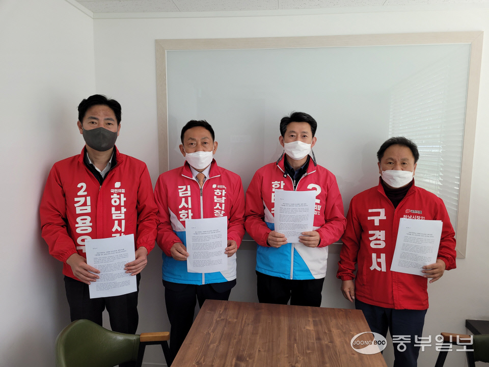 국민의힘 하남시장 예비후보들이 24일 오전 국민의힘 중앙당 공천심사위원회가 이현재 예비후보를 하남시장 후보로 단수 공천을 하려는 움직임을 보이자 강력히 반대하는 성명서를 발표하고 집단행동에 나서기로 했다.