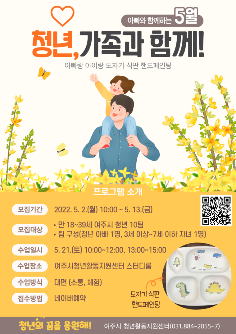 이번에 진행하는 ‘청년, 가족과 함께’ 프로그램은 평소 자녀와 함께 시간을 보내기 힘든 청년 아빠를 위한 프로그램으로 자녀와 함께 소통하며 초벌된 도자기 식판에 자유롭게 핸드페인팅을 해보며 행복하고 즐거운 시간을 보낼 수 있도록 진행할 예정이다.