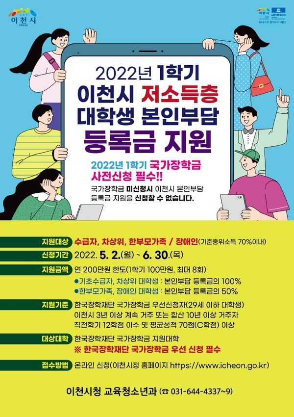 올해부터 이천시가 법정저소득층 대학생들을 위해 본인부담등록금을 지원한다.