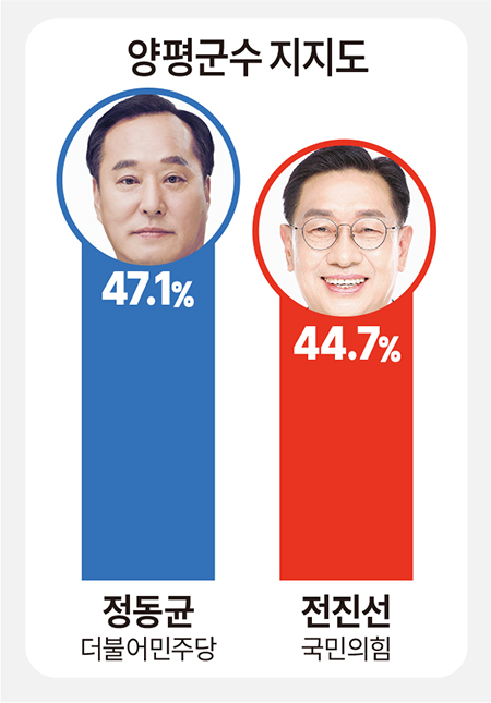 18일 중부일보 의뢰로 여론조사기관 데일리리서치가 양평군 거주 만 18세 이상 남녀 500명을 대상으로 지난 13일부터 14일까지 이틀간 실시한 여론조사 결과(95% 신뢰수준에 오차범위 ±4.4%p)에 따르면 현직인 정동균 더불어민주당 양평군수 후보는 47.1%를 얻었다. 이어 전진선 국민의힘 후보는 44.7%를 얻어 두 후보 간 지지율 격차는 오차 범위 안인 2.4%p로 초박빙 양상이었다.