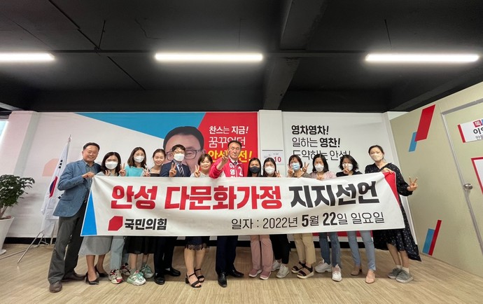 안성의 다문화가정이 22일 국민의힘 안성시장 후보 이영찬 선거사무소에서 간담회를 가진 뒤 즉석에서 지지를 선언했다.