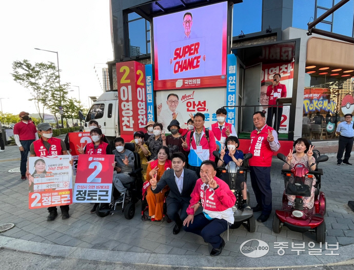 이영찬 국민의힘 안성시장 후보가 지난 27일 안성 시티아파트 사거리에서 안성시 원도심 및 동부권 지역의 발전과 삶의 질 향상을 위해 국민의힘 후보자들과 집중유세를 했다.