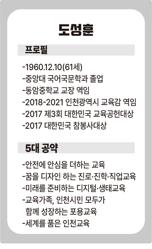 인천시민 여러분, 인천광역시 교육감 후보 도성훈입니다. 지난 4년간, 아이들의 미래와 인천교육을 위해 단 한 명의 아이도 포기하지 않겠다는 일념으로 달려온 저는, 그간의 성과에 대한 냉철한 성찰과 시민 여러분의 격려를 바탕으로 다시 또 여러분의 선택 앞에 섰습니다.