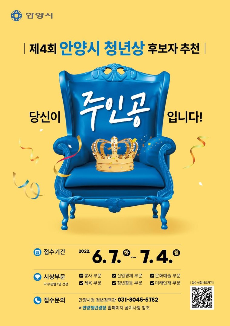 올해로 4회째를 맞는 안양시 청년상은 봉사, 산업경제, 문화예술, 체육, 청년활동, 미래인재 등 6개 부문에서 각 1명씩 선발된다.