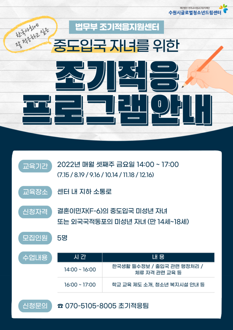 - 수원시글로벌청소년드림센터, 중도입국청소년 조기적응지원센터 지정…참여 학생 모집 수원시글로벌청소년드림센터(이하 센터)가 법무부가 지원하는 조기적응지원센터로 지정돼 중도입국 청소년들을 위한 조기적응 프로그램을 운영한다.조기적응프로그램은 국내에 장기 체류할 목적으로 합법적인 체류 외국인이라면 선택적으로 이수해야 하는 프로그램이다. 밀집지역 외국인, 외국인 유학생, 외국인 연예인, 결혼이민자, 중도입국자녀, 외국국적동포 등 체류 유형에 따라 맞춤형 교육이 제공된다.기존 중도입국 청소년을 대상으로 하는 조기적응 프로그램은 결혼이민자(F-6)의 자녀로서 외국에서 출생한 뒤 성장 과정 중 한국에 입국해 체류하게 된 미성년