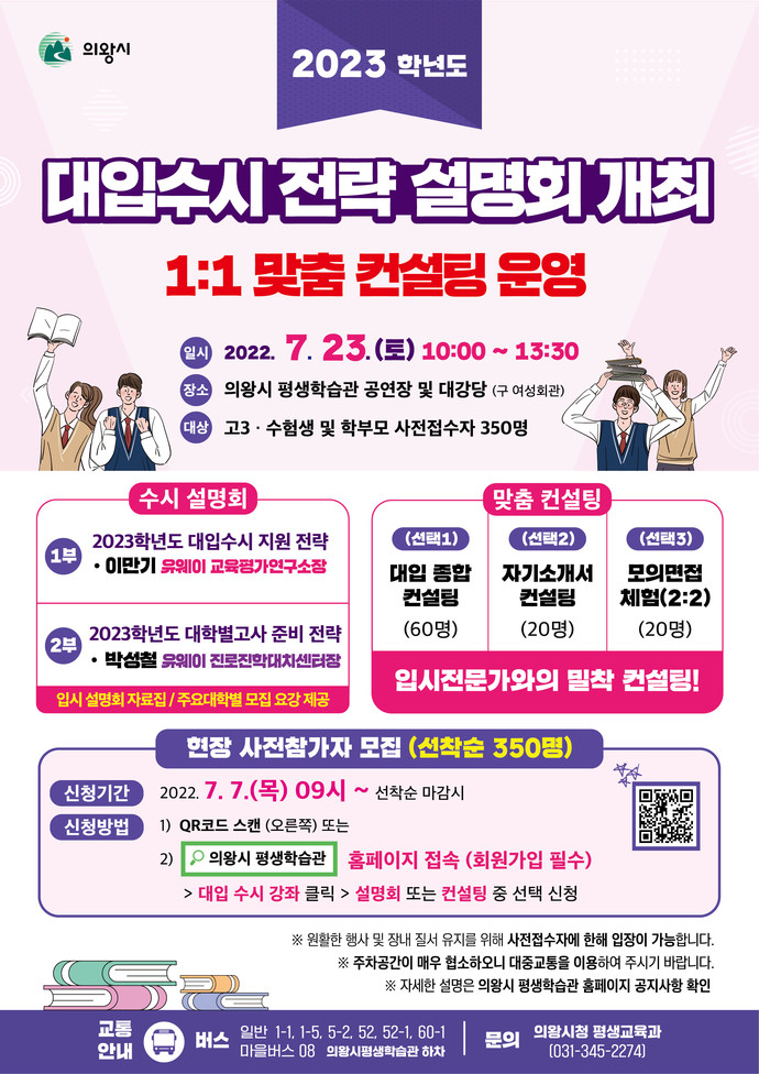 시는 원활한 대입 행사 진행을 위해 7월 7일 오전 9시부터 의왕시평생학습관 홈페이지(edu.uiwang.go.kr)를 통해 현장 참여자를 선착순으로 모집하며, 자세한 사항은 의왕시 평생학습관 홈페이지에서 확인할 수 있다.