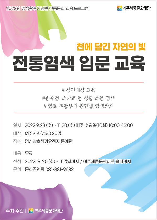 여주세종문화재단은 오는 20일부터 명성황후기념관 전통문화 교육프로그램 ‘천에 담긴 자연의 빛-전통염색 입문 교육’ 수강생을 모집한다도 19일 밝혔다.