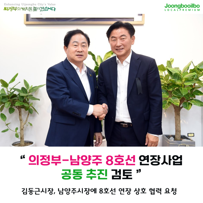 이날 김동근 시장은 주광덕 남양주시장과의 면담에서 의정부시와 남양주시가 수도권 순환철도망의 완성과 경기 동북부 지역의 균형발전을 위해 8호선 연장 타당성 검토용역을 공동으로 시행하는 등 상호 협력할 것을 요청했다. 향후 「국가철도망 구축계획」 수립 시 국가 정책적인 차원에서 8호선 연장사업이 반영ㆍ추진될 수 있도록 공동으로 건의하자고 제안했다.