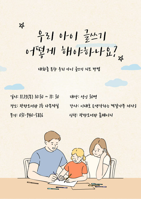 파주시 광탄도서관은 오는 17일 광탄도서관 1층 다목적실에서 이대호 작가의 ‘우리 아이 글쓰기 어떻게 해야 하나요?’ 강연을 진행한다.