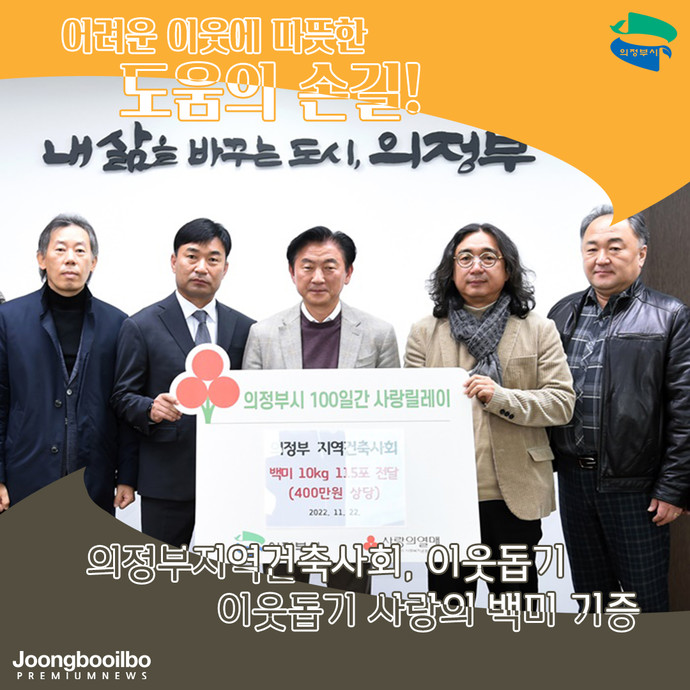 한편, ‘100일간 사랑릴레이 배턴잇기 운동’은 2022년 10월 13일부터 2023년 1월 20일까지 100일간 진행된다. 성금이나 쌀, 라면, 김장김치, 연탄 등의 현물 등을 해당 의정부시 복지정책과, 권역동 행정복지센터, 동 주민센터에 방문하거나 전화로 접수하면 된다.
