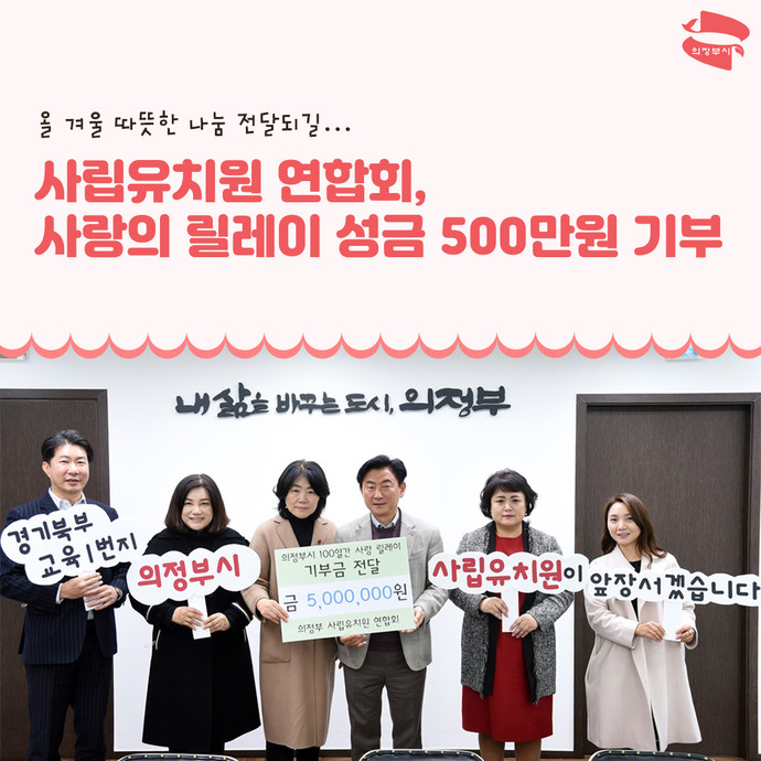 의정부시에 따르면 지난 28일 의정부시 사립유치원 연합회가 시청을 방문해 ‘100일간 사랑릴레이 배턴잇기’ 성금 500만 원을 기부했다고 밝혔다.
