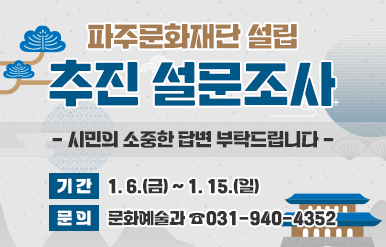 김지숙 문화예술과장은 “시민의 뜻이 적극 반영될 수 있도록 설문조사를 통해 수렴한 의견을 적극 검토해 파주문화재단 설립 타당성 용역 결과에 반영하겠다”며 “지역문화 발전을 주도하는 문화재단이 설립될 수 있도록 내실 있게 추진해 나가겠다”고 전했다.