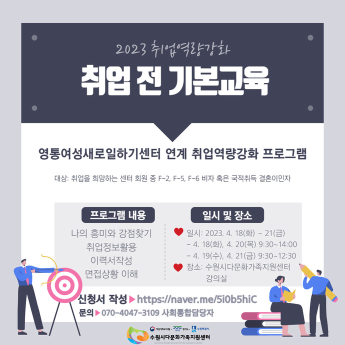수원다문화가족지원센터와 영통여성새로일하기센터가 오는 18일부터 21일까지 ‘취업 전 교육 프로그램’을 진행한다.