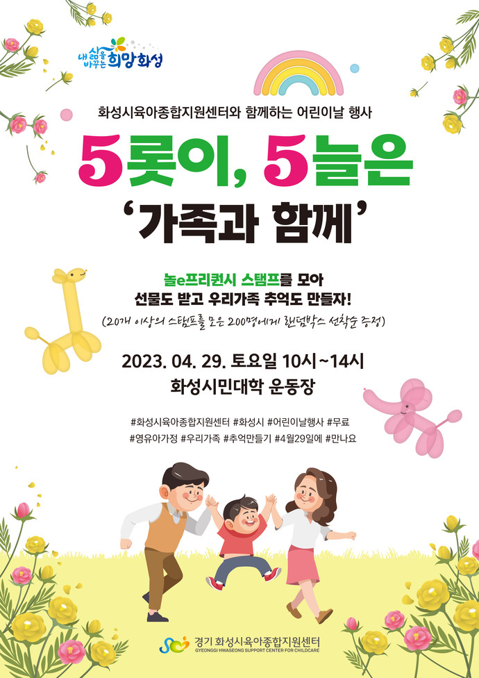 화성시육아종합지원센터가 어린이날을 맞아 오는 29일 ‘5롯이, 5늘은 가족과 함께’ 행사를 개최한다.