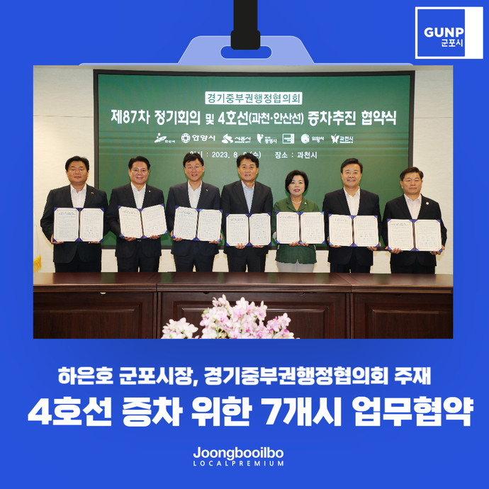 하은호 군포시장은 경기중부권행정협의회를 주재하고 과천·안산·안양·시흥·광명·군포·의왕시 7개 시장이 4호선(과천~안산선) 중차를 위한 협약을 체결했다고 10일 밝혔다.