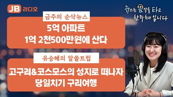 ‘뉴스는 음악을 타고 한주혜입니다(뉴음타)’ 14일 방송에서는 ‘5억 아파트 1억2천500만 원에 산다’, ‘미분양의 무덤 평택시… 주범은 화양지구’ 등 한 주간의 유익한 뉴스를 상세하게 전합니다.