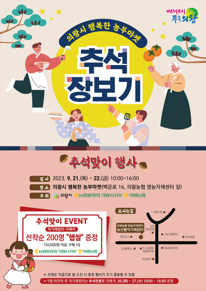 이번 추석맞이 행사에는 기존 장터 참여 농가뿐만 아니라 로컬푸드 판매 농가도 참여해 채소, 햅쌀, 버섯, 과일, 벌꿀 등 다양한 품목의 농산물을 판매한다. 또한 1만 원 이상 구매한 시민에게는 농협중앙회 의왕시지부와 의왕농협에서 준비한 햅쌀(500g)을 선착순 증정할 예정이다.