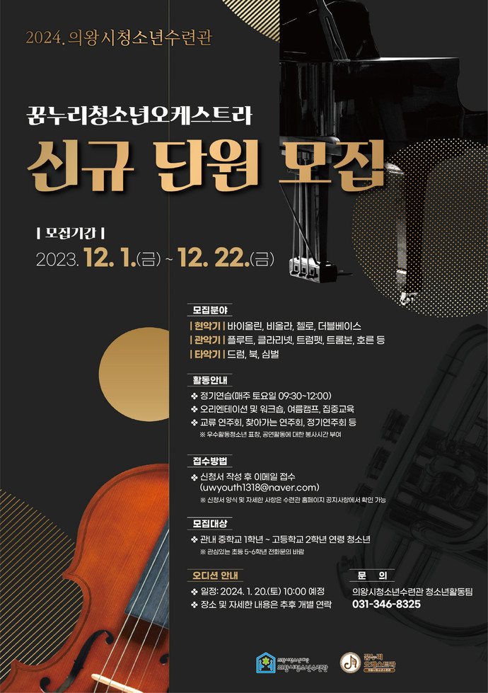 모집 기간은 2023년 12월 1일부터 22일까지며, 의왕시청소년수련관 홈페이지 공지사항에서 오디션 신청서를 내려받아 작성한 뒤 이메일(uwyouth1318@naver.com)로 접수하면 된다. 오디션은 내년 1월 20일 진행하며, 최종 합격 시 꿈누리청소년오케스트라 단원으로 활동을 시작할 수 있다. 개별 오디션에 관한 자세한 사항은 지원자에게 추후 개별 안내할 예정이다.