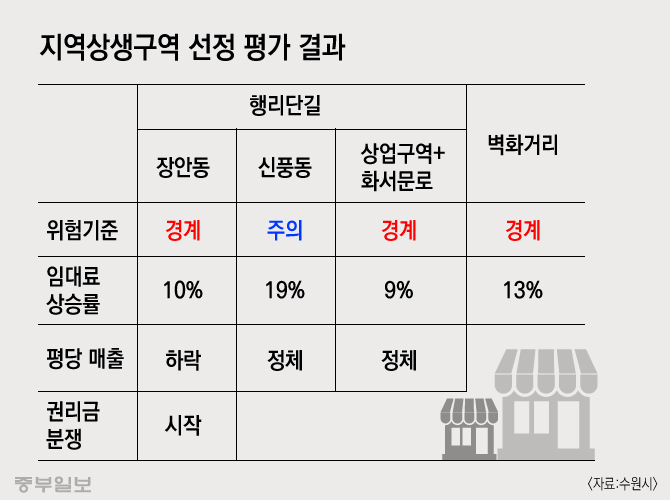 젠트리피케이션 위험지표 평가는 지난해 기준 3년 치 5가지 하위변수(주거인구 증가율, 창폐업, 유동인구 증가율, 프랜차이즈 증가율, 3년 차 생존율)를 측정해 이뤄진다. 평가 내 행리단길은 팔달구 장안동·신풍동 일대 면적 17만730㎡를 의미한다.
