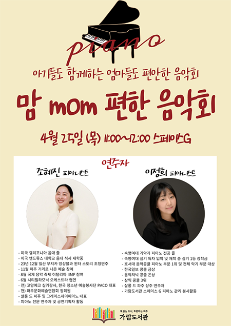 이번 공연에서는 조혜진, 이정희 두 피아니스트의 연주로 ’작은 별‘로 알려진 모차르트의 변주곡 ’아 어머니께 말씀드릴게요‘를 비롯해 베토벤, 드뷔시 등의 편안하고 아름다운 곡을 선보일 예정이다.