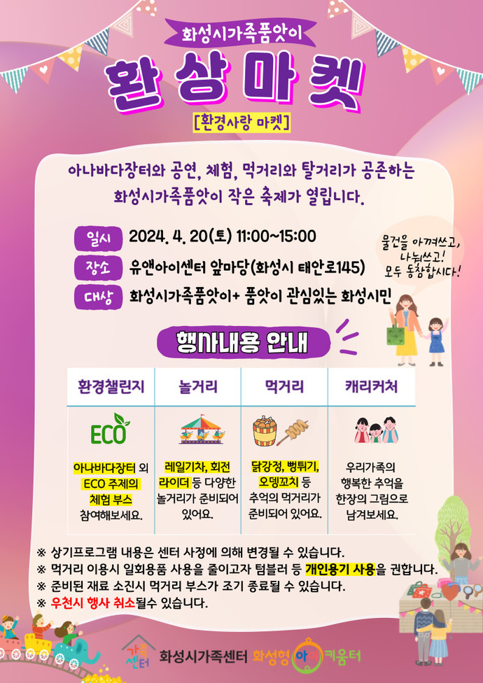 화성시가 4월 22일 지구의 날을 맞아 20일 유앤아이센터 앞마당에서 ‘화성시 가족품앗이 환상마켓’ 행사를 개최한다.