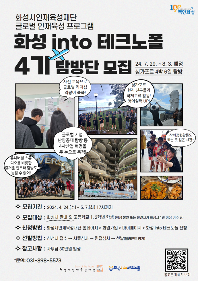 화성 into 테크노폴 4기 싱가포르 탐방단은 관내 고등학교 1, 2학년 학생 30명을 선발한다.