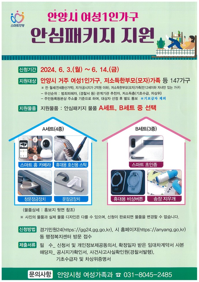 안양시는 여성 1인 가구의 안전한 일상을 돕기 위한 ‘여성 1인 가구 안심패키지 지원사업’을 실시하고 오는 14일까지 신청자를 모집한다고 3일 밝혔다.