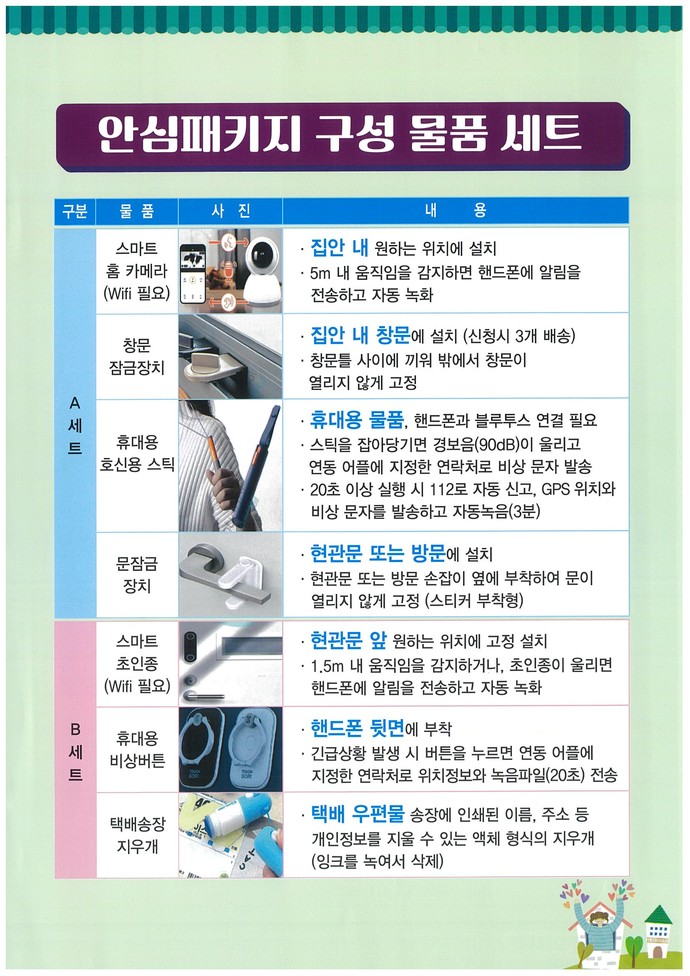 안심패키지 지원물품은 ▶(A세트, 구성품 4종) 스마트 홈 카메라, 창문 잠금장치, 호신용 스틱, 문 잠금장치 ▶(B세트, 구성품 3종) 스마트 초인종, 휴대용 비상버튼, 택배 송장 지우개 등이다. 대상자가 이 중 1개 세트를 선택할 수 있다.