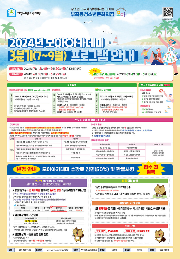 (재)의왕시청소년재단 부곡동청소년문화의집에서 모아아카데미 3분기(7~9월) 수강생을 모집한다고 10일 밝혔다.