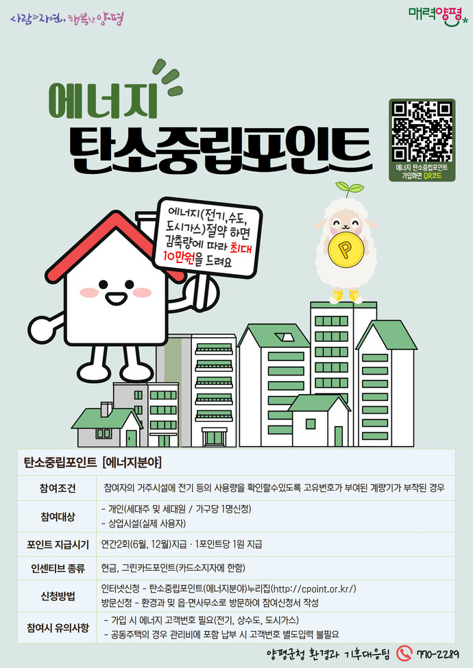 탄소중립포인트 에너지 분야 적립에 참여하려면 ‘탄소중립포인트 에너지’ 누리집을 이용하거나 양평군청 환경과 또는 읍·면사무소에 방문해 신청 가능하다.