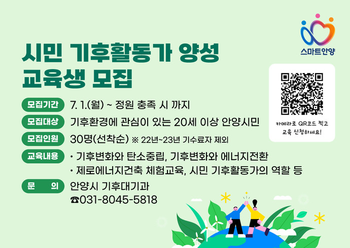 안양시는 탄소중립 실현을 이끌어 갈 '시민 기후활동가'를 양성하고자 전문 교육(양성교육)을 추진하고 참여자 30명을 선착순으로 모집 중이라고 2일 밝혔다.