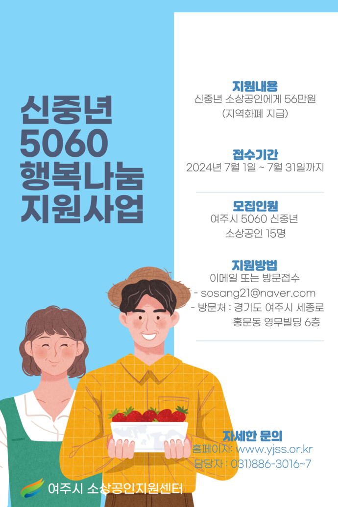 지원 대상자는 주민등록상 주소지가 공고일인 2024년 6월 24일 기준으로 여주시로 되어 있고, 5060세대(1974년~1964년생)이다. 자세한 내용은 여주시 소상공인지원센터 홈페이지(https://yjss.or.kr)에서 확인할 수 있다.
