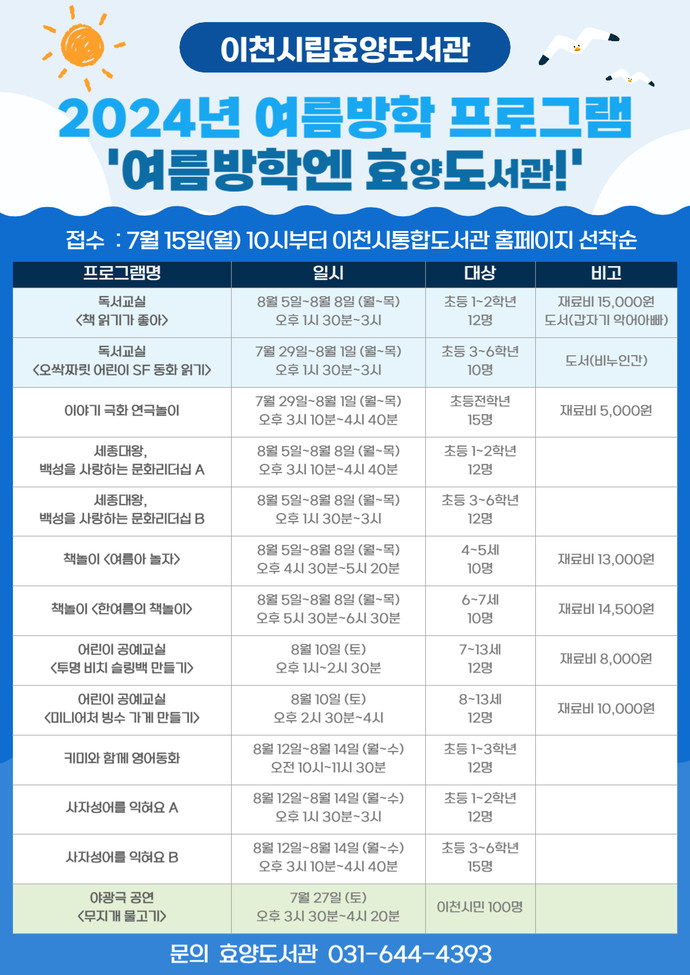 이천시 효양도서관은 2024년 7월 27일부터 유아와 초등학생을 대상으로 여름방학 프로그램 '여름방학엔 효양도서관!'과 여름 독서교실을 운영한다고 9일 밝혔다.