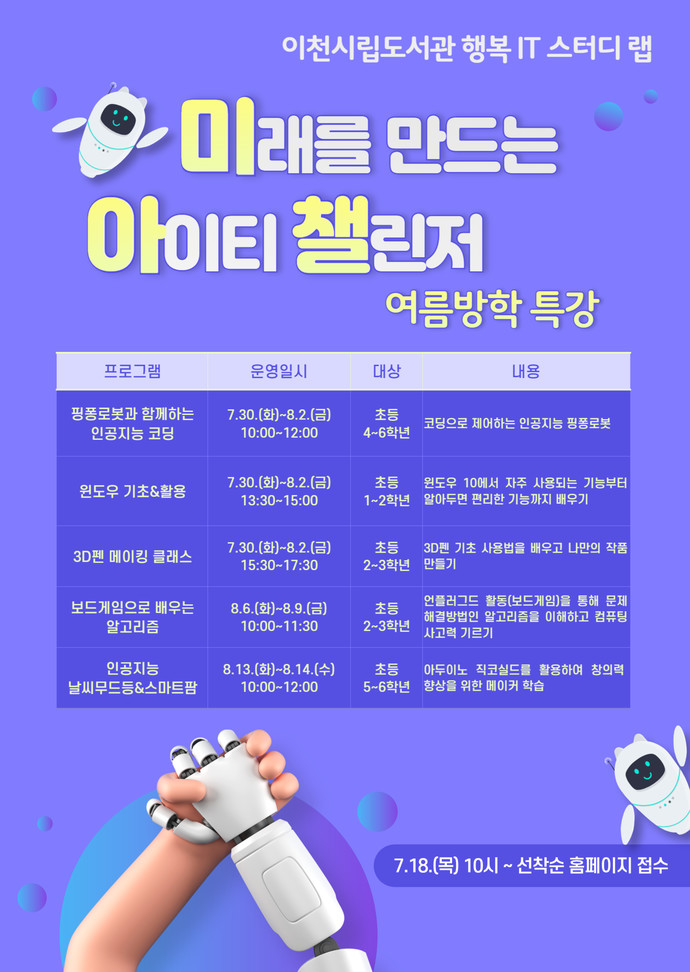 이천시립도서관은 오는 30일부터 '미래를 만드는 IT 챌린저'(이하 미아챌) 여름방학 특강을 운영한다고 15일 밝혔다.