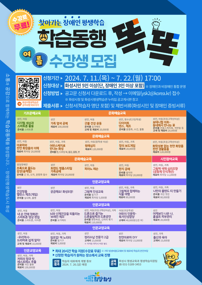 ‘학습동행 똑똑’은 화성시 거주 장애인 3인 이상을 포함한 총 5인 이상의 시민이 직접 학습모임을 구성해 수강을 희망하는 강좌, 시간, 장소를 정해 신청하는 학습자 중심의 평생학습 프로그램이다. 강좌로는 ▶기초문해교육 ▶문화예술교육 ▶시민참여교육 ▶인문교양교육 등 4개 분야 총 31개 강좌가 개설된다. 학습 장소는 장애인 단체, 시설, 기관, 가정 등 학습모임이 가능한 곳이면 어디든지 가능하다.