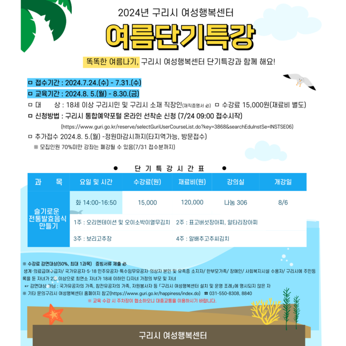 구리시 여성행복센터는 오는 7월 24일부터 7월 31일까지 구리시 통합예약포털을 통해 '2024년 여성행복센터 단기특강 교육프로그램' 수강생을 선착순 모집한다고 17일 밝혔다.