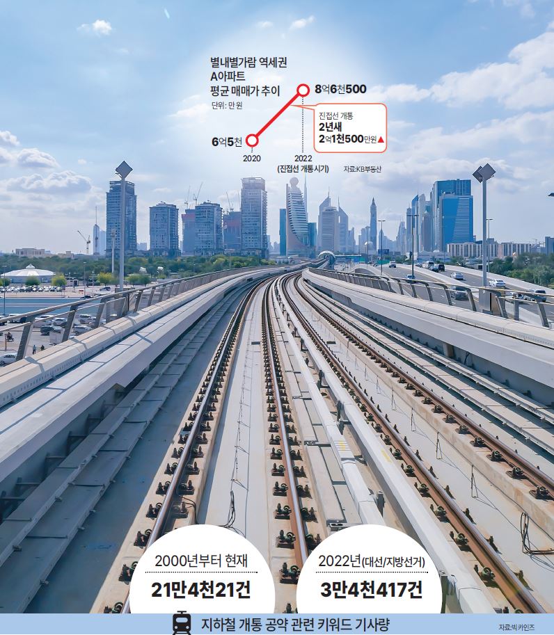 이렇게 경제적 관심이 높은 만큼, 전철 유치는 선거철의 화두가 돼 왔다. 빅카인즈에서 지하철 개통과 관련한 키워드와 ‘공약’을 연관지어 기사를 검색하면 2000년도부터 지금까지 총 21만 4천21건이 검색된다. 특히 20대 대통령 선거와 제8회 지방선거가 있었던 2022년에는 3만 4천 417건이 나와 검색 기간 중 가장 많은 수를 기록했다. 관련어를 살펴보면 GTX(경기도 광역급행철도)가 가장 큰 부분을 차지하고, 인물은 윤석열 대통령 당선인(후보), 지역은 수도권·인천·천안·김포·동탄·의정부 등이 눈에 띈다. 20대 대선에서 GTX는 당시 윤석열 국민의힘 후보와 이재명 더불어민주당 후보가 모두 자신의 안을 내놓고 경쟁한 공약이었다. 교통은 곧 경제며 정치다.