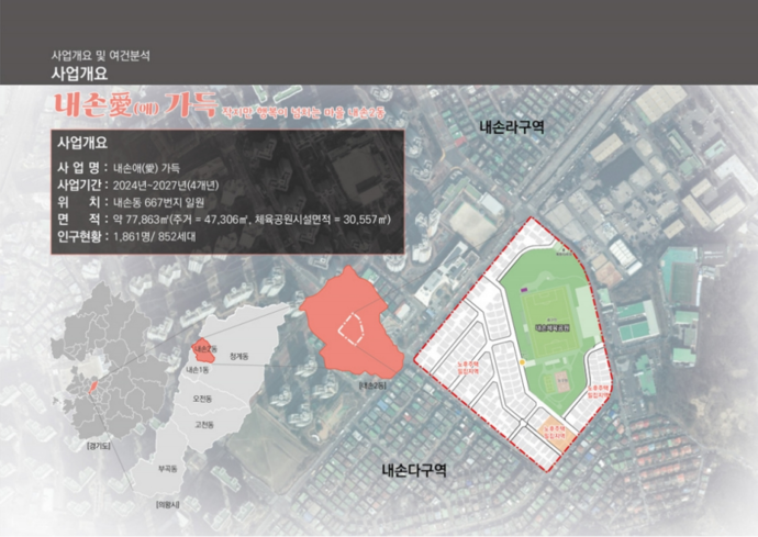 이번 사업은 내손동 정주 환경 개선을 위해 생활권 내 도로 등 기초 기반 시설을 갖추고 있으나 인구 유출, 주거지 노후화로 활력을 상실한 주택 밀집 주거지역을 대상으로 추진한다.