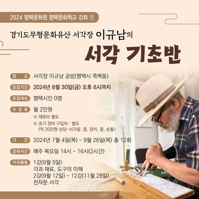모집대상과 정원은 평택시민이며 10명으로, 모집기간은 2024년 8월 30일 금요일 오후 6시까지이다. 강좌는 2024년 9월 5일 목요일부터 2024년 11월 28일 3개월간 목요일까지 매주 목요일 오후 2시부터 4시까지 비전동 서각장 이규남 공방에서 진행한다.