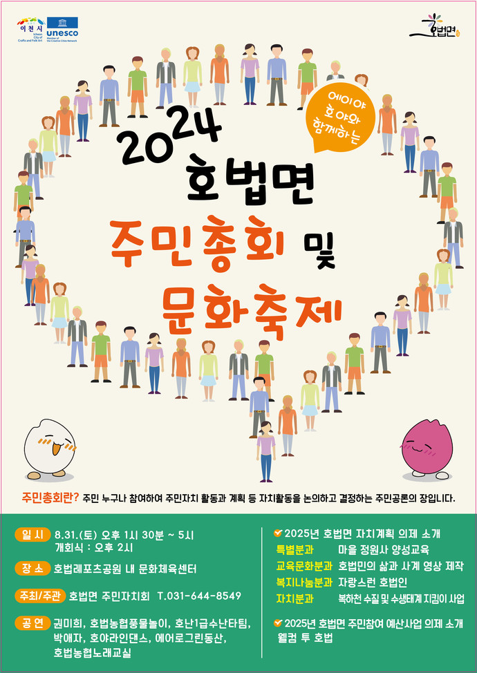 호법면은 오는 8월 31일(토) 호법레포츠공원에서 호법농협 풍물놀이의 경쾌한 소리와 함께 ‘2024년 호법면 주민총회 및 문화축제’를 연다고 밝혔다.