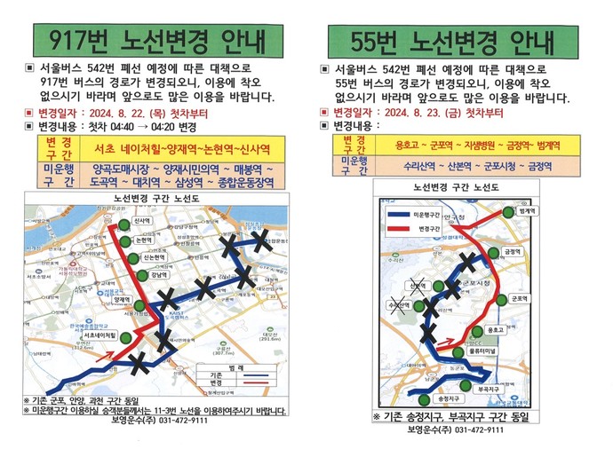 또한, 군포지역을 오가는 55번 버스(군포송정지구-금정역)도 23일부터 송정지구-부곡지구-용호고-군포역-금정역-범계역 구간으로 변경되어 운행된다.