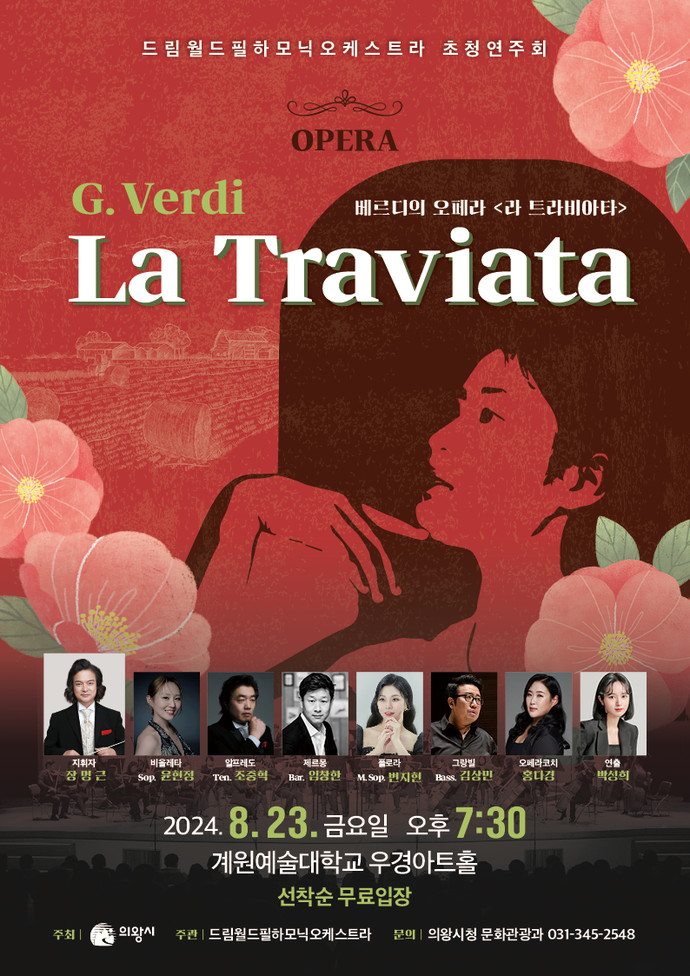 의왕시(시장 김성제)는 오는 23일 오후 7시 30분, 계원예술대학교 우경아트홀에서 오페라 ‘라 트라비아타(La Traviata)’ 공연을 개최한다고 밝혔다. 이번 공연은 드림월드필하모닉오케스트라 초청으로 이루어지며, 주세페 베르디의 오페라를 주제로 진행된다.