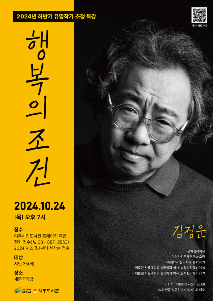 여주시는 29일, 오는 10월 24일 오후 7시 세종국악당에서 문화심리학자 김정운 박사를 초청해 '행복의 조건'을 주제로 특별강연을 개최한다고 밝혔다.