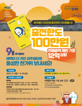 김경일 파주시장은 "혜택이 커진 파주페이로 시민과 소상공인 모두 풍성한 추석 명절을 보내시길 바란다"며, "지역경제 활성화에 기여하는 파주페이를 적극적으로 이용해 달라"고 당부했다.