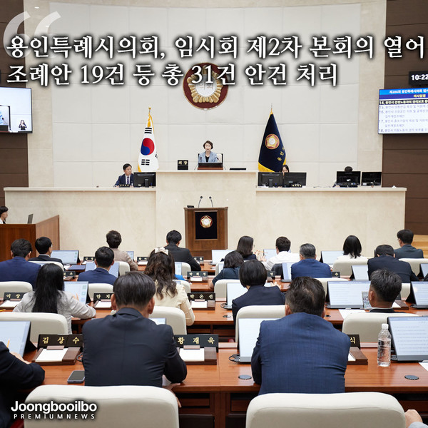 이번 본회의에서는 ▶행정사무감사 계획서 승인의 건 ▶용인시 통·리·반 설치 및 통장·이장 정원 조례 일부개정조례안 ▶용인시 디지털성범죄 예방 및 피해자 보호·지원에 관한 조례안 ▶용인시 감정노동자의 권리보호 등에 관한 조례안 ▶용인시 도시 및 주거환경정비 조례 일부개정조례안 등 조례안 19건, 공유재산 관리계획안 1건, 동의안 5건, 의견제시 5건, 기타 1건 등 총 31건의 안건이 가결됐다.