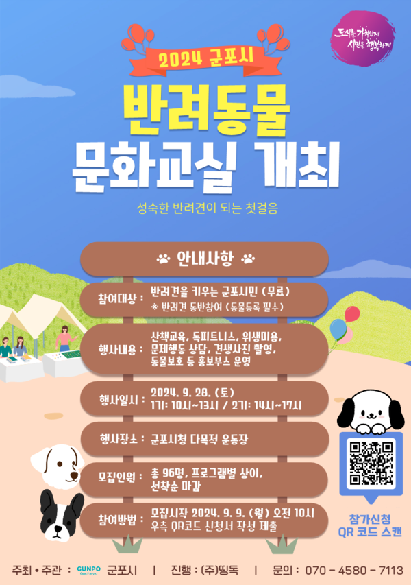 군포시는 9월 28일, 군포시청 다목적 운동장에서 '2024년 반려동물 문화교실'을 개최한다. 이번 행사는 반려동물과 함께하는 성숙한 시민 문화를 조성하기 위해 기획됐으며, 동물등록이 된 반려견을 기르는 군포시민이 참여할 수 있다.