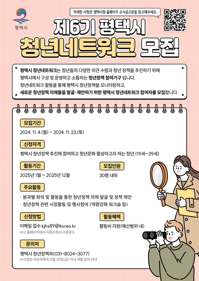평택시가 청년의 다양한 의견을 수렴하고 정책 추진을 위해 ‘제6기 평택시 청년네트워크’(이하 평청넷) 참여자를 모집한다.