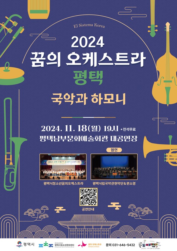 ‘꿈의 오케스트라 평택’은 청소년들이 음악 활동을 통해 자존감을 키우고, 오케스트라 합주를 통해 협동과 발전을 도모하는 프로그램으로, 12년간 이어져 왔다. 연주회에서는 음악감독 김종영과 48명의 단원들이 국악과 오케스트라가 어우러지는 특별한 무대를 선보인다. 또한, 평택시립국악관현악단과 판소리 편소영의 협연으로 풍성한 공연이 준비돼 있다.