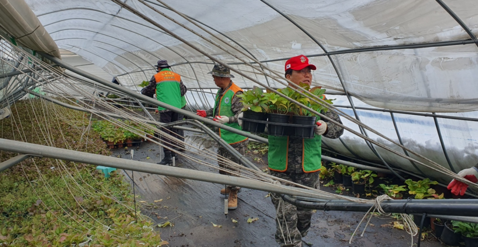 방재단은 붕괴된 비닐하우스 내부의 구조물을 정리하고 상품 가치가 있는 화분을 안전한 장소로 옮기는 한편, 약해진 비닐하우스를 보수해 추가 붕괴를 예방하는 작업을 병행했다.