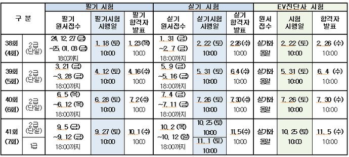 EV진단사도 올해 3회서 내년에는 4회로 확대하여 자동차진단평가사 실기시험 일정과 같은 날에 실시한다.